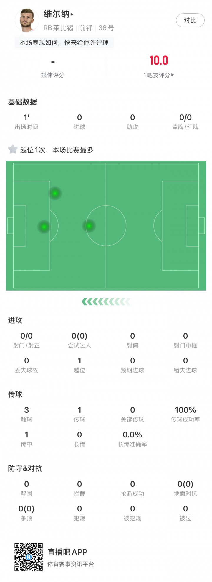 维尔纳在最近一场对阵沃尔夫斯堡的比赛中替补登场三分钟,完成一次越位,还挡出了队友安东尼奥-努萨的一脚射门,自己则没有完成射门。